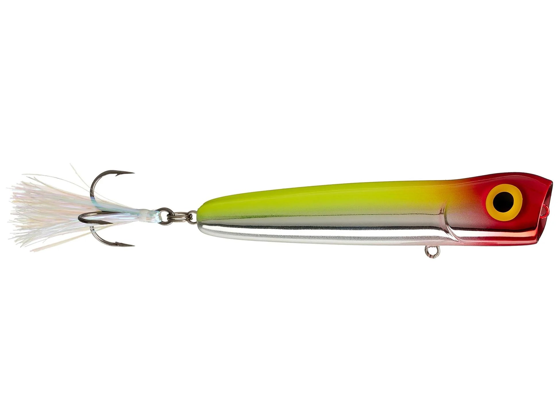 Storm Chug Bugs have been a favorite for many topwater fishermen for years and no wonder, with their proven fish-catching ability and versatility. These big popper baits can be twitched and splashed like any other popper. With a faster retrieve, they will walk-the-dog and spit and pop, making bass pay attention even from deep water or thick cover. They cast easily, even with baitcasting gear, because of the weighted tail section that also gives them their unique action. Great paint jobs, deep finishes, and pearl Mylar fire tails round out the package for a real fish-catching topwater bait that won't just sit in the box.